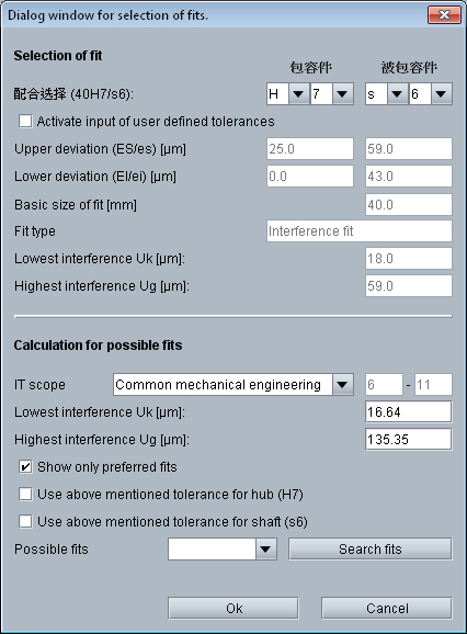 该模块还有不同参数的设计计算功能,如最小结合长度、最小结合直径、最小传递的转矩及最小轴向力。另外,通过过盈配合选择功能,提供可能的过盈配合建议。 这里可以限制公差组配时最小或者最大的过盈量。 支持DIN ISO 286标准下所有公差等级和公差带。 其次,还可以将公差配合限制为 „优先配合“。 对特别的公差组配,用户可自定义下极限偏差和上极限偏差。