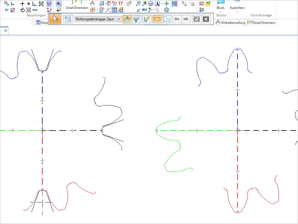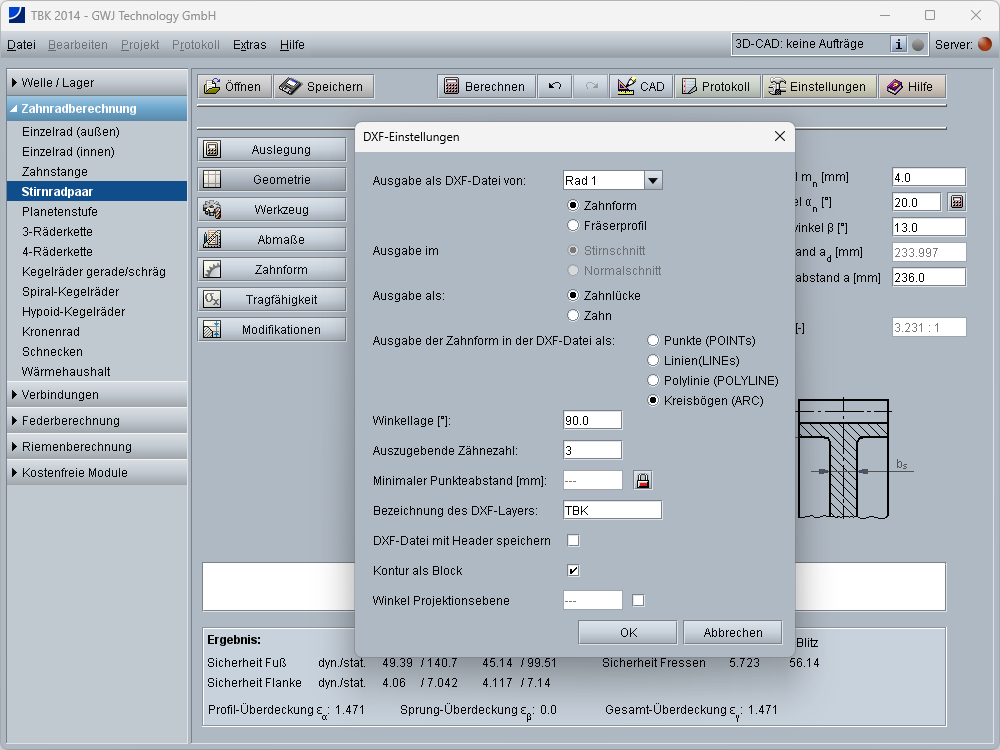 Für evolventischen Zahnformen ist die Ausgabe im 2D-DXF-Format mit verschiedenen Einstelloptionen möglich. Die DXF-Ausgabe steht für Einzelstirnräder (außen/innen), Stirnradpaare, Planetenstufen, 3er- und 4er-Räderkette, Zahnstange-Ritzel und Zahnwellenverbindungen zur Verfügung.