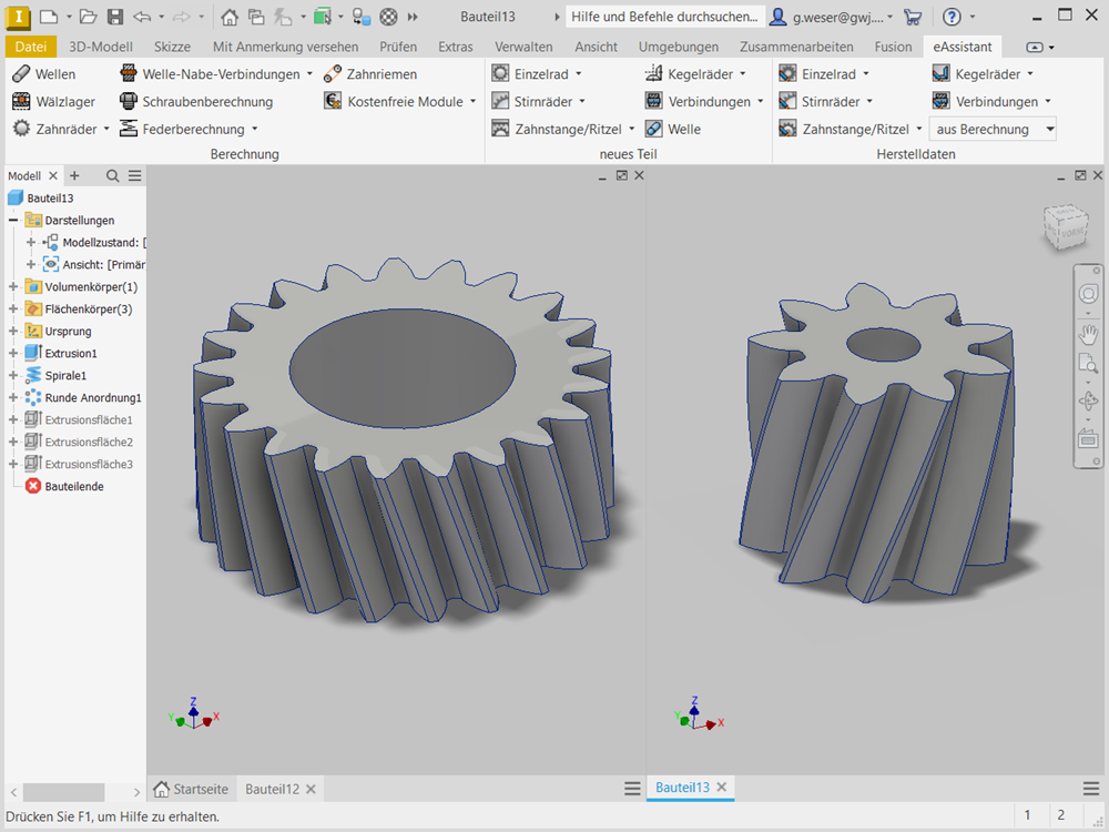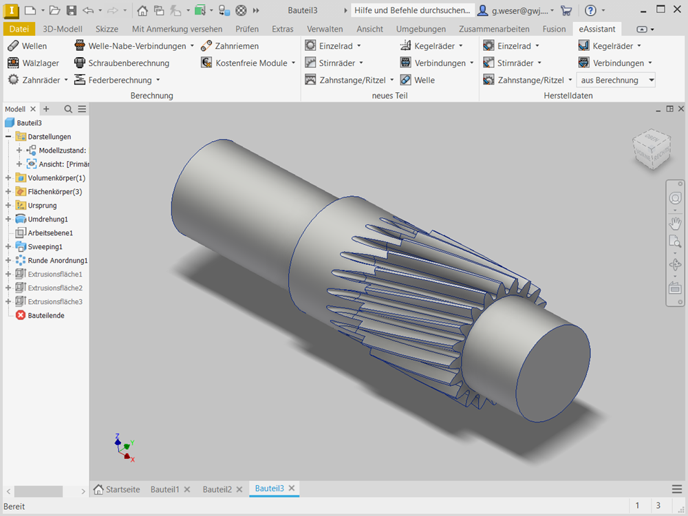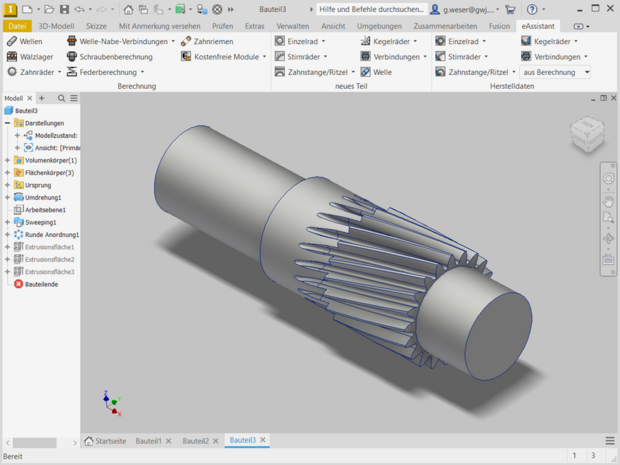 Weiterhin können auf Basis der Berechnung gerad-, schräg- und spiralverzahnte Kegelräder automatisch direkt als 3D-Autodesk Inventor-Teil generiert werden.