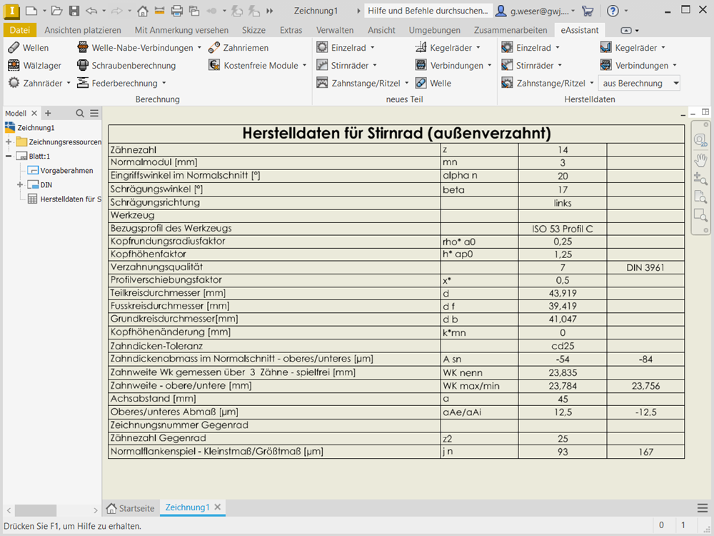 Zu den entsprechenden 2D-Ableitungen der Stirnräder, Kegelräder oder Zahnwellenprofile können jederzeit per Mausklick auch die Herstelldaten auf die Zeichnung platziert werden. Diese Tabellen sind individuell über eine Vorlagendatei konfigurierbar.