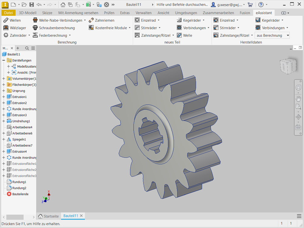 Die Stirnradverzahnung kann als Einzelteil oder auf einem bereits bestehenden Teil erzeugt werden. Bei Erzeugung auf einem bestehenden Teil wird auch die Modellierung eines Verzahnungsauslaufs unter Vorgabe des Fräserradiuses und eines Offsets (Verlängerung der Zahnbreite) unterstützt.