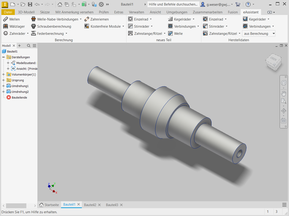 Über das CAD-PlugIn können auch schnell und einfach Wellen im 3D generiert werden. Die Wellengeometrie kann sehr komfortabel im Wellenberechnungsmodul modelliert und anschließend im 3D automatisch aufgebaut werden. Dabei sind Voll- und Hohlwellen mit beliebig vielen zylindrischen und konischen Wellensegmenten möglich.