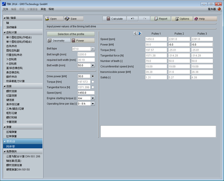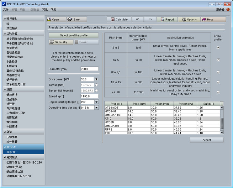 计算过程依照 《同步带传动 - 特征, 标准, 计算, 设计》, Nagel,2008 年,Hanser 出版社。 该模块的开发是在和Thomas Nagel博士(TU Dresden)的密切合作基础上完成的,所以是一个脱离厂家的同步带传动计算工具。