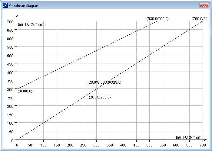 最重要的计算结果如静态的和动态的许用应力的利用率,弹簧工作行程以及许用弹簧压缩量的利用率等显示在结果报告窗口。另外,还显示和Goodman-曲线图,负载-压缩量图。图形可以通过鼠标点击放大显示。