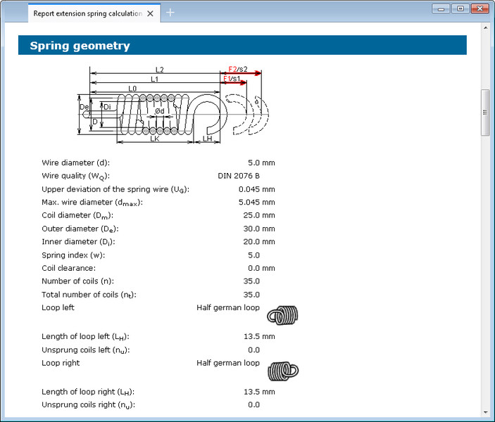 可以计算疲劳负载或者静态/半静态状态的拉伸弹簧。弹簧材料可以方便地从材料数据库中选取,或者用户自定义输入。因此,特殊材料的计算也成为可能。对于热成型的弹簧材料可以定义节距。 另外,弹簧直径的公差根据DIN 2076 B 和 C, DIN 2077 或者用户自定义输入。 据所选材料制造工艺的不同,也就是说热轧或者冷成型,公差的计算按照 DIN 2096 或者 DIN 2097。另外,模块可以计算弹簧的固定频率。计算时还可以考虑工作温度的影响。 räg