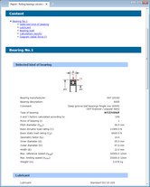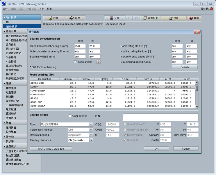 在数据库中集成了NSK, SKF, SNR及KOYO等轴承厂家的近20,000个轴承。 用户在选择好厂家、轴承类型以及完成载荷输入后,便可从一个表中选择所要的轴承;或者通过轴承查找功能迅速简便地找到所需轴承。轴承查找功能可以分别设定下列参数