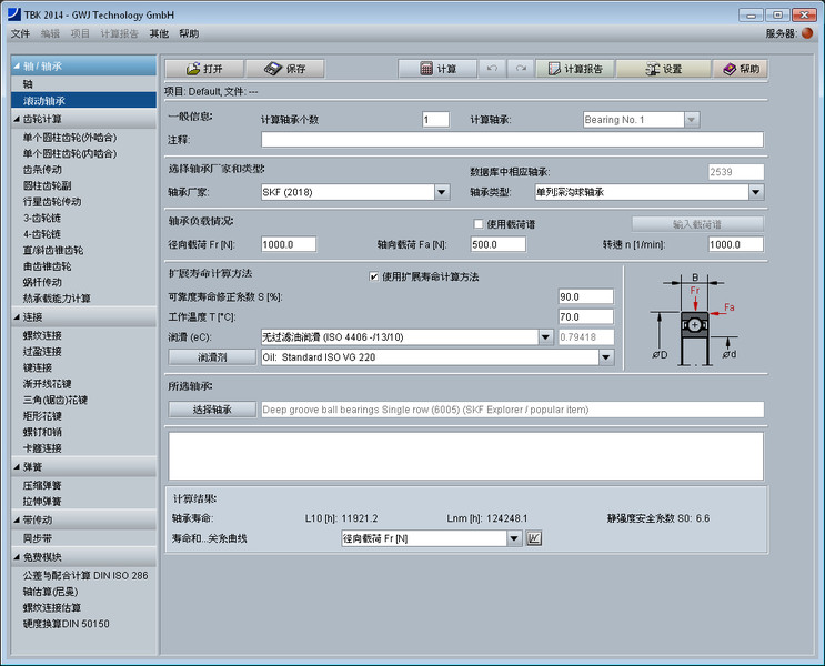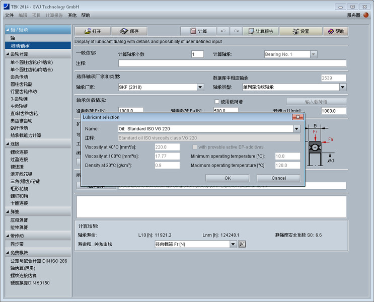 再者,计算扩展寿命时,可从数据库中选择不同的润滑油和润滑油脂或者用户自定义。 数据库中集成了不同厂家如Lubricant Consult, Fuchs Lubritech, Aral 以及BP的产品。 另外,计算时考虑了可靠度寿命修正系数,工作温度以及工作环境洁净度等因素的影响。
