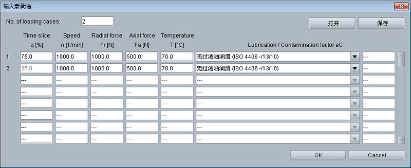 也可以计算载荷谱下的轴承。这里可以定义任意多个负载情况。对每种负载情况可定义其时间分配、径向载荷及轴向载荷、温度以及工作环境洁净度。载荷谱可以脱离相应的轴承计算,单独另外存储和调用。