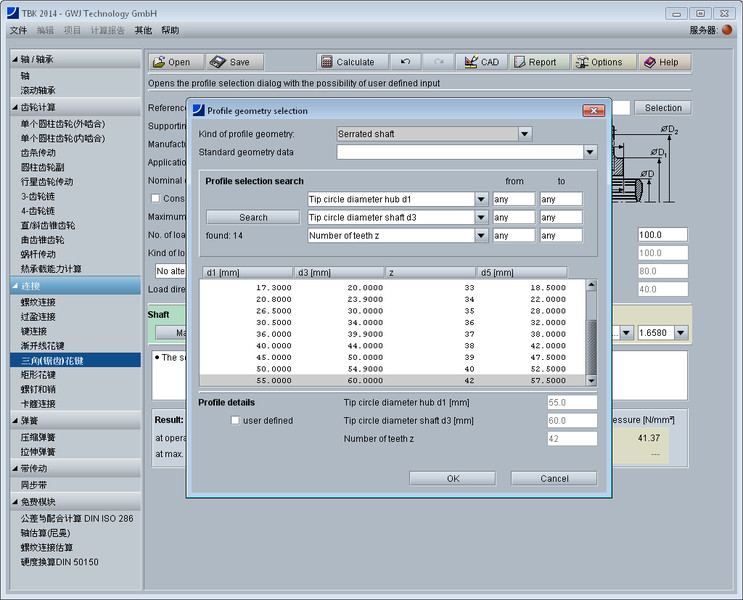 该模块可以对DIN 5481标准规定的锯齿花键轴毂连接进行强度校核计算。计算依据Niemann的《机械零件》第1册,2001年版。花键的几何尺寸可以方便地从数据库中选取,或者通过查找得出。对于偏离标准的齿廓,用户可以自定义输入。