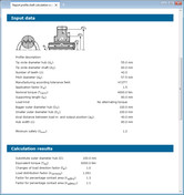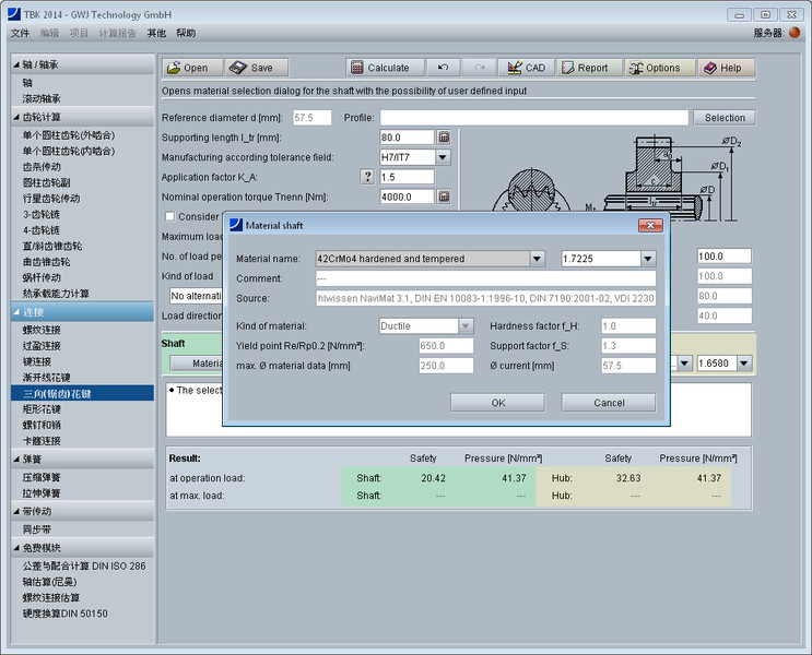 还在输入过程中,结果显示窗口显示轴和轮毂分别在正常工作时以及最大负载工作时的安全系数及许用压力。计算完成后,可以生成计算报告存档。报告包含了计算方法,输入的数据以及详细易懂的结果。报告可为HTML或者PDF文件格式。