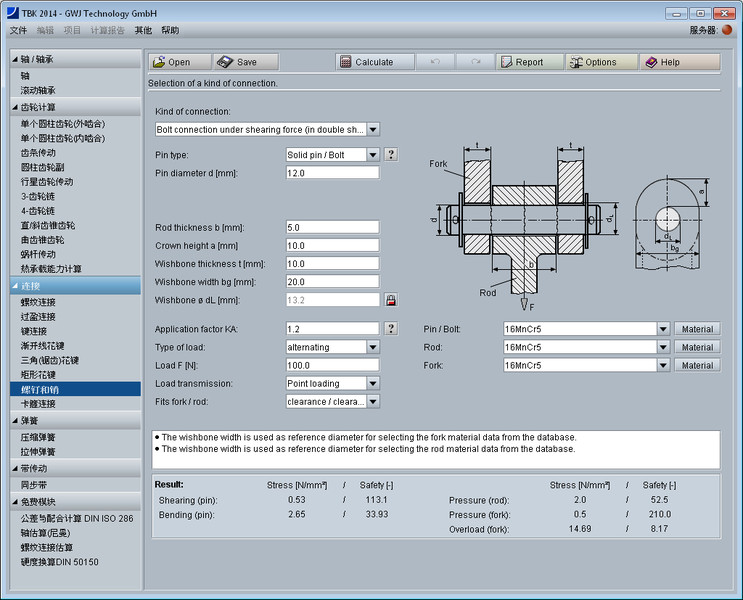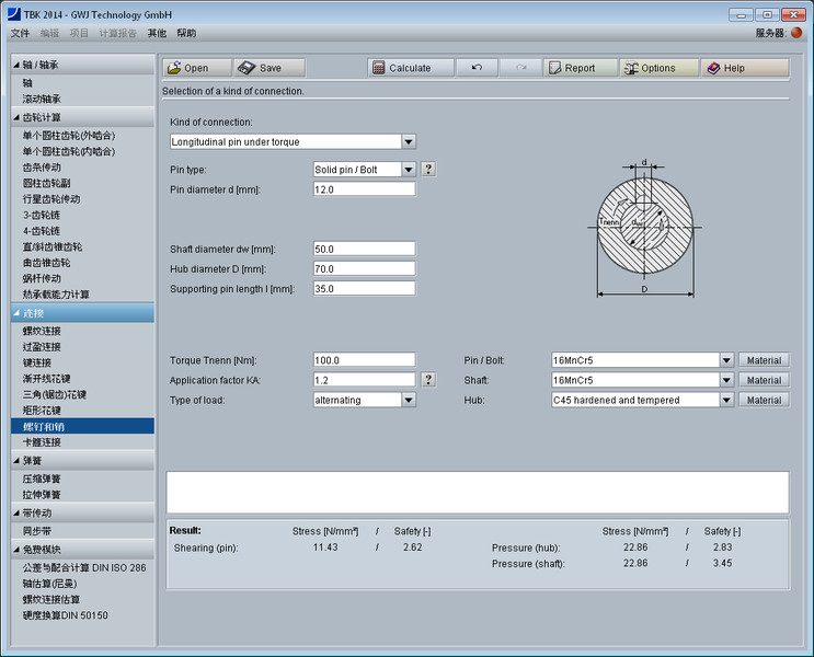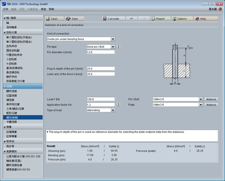所有的计算依据公认的如Niemann和Decker所著专业文献。再者,计算时可选择不同的销钉类型如,圆柱销或者实心销、槽销、弹性圆柱销(直槽)、弹性圆柱销(卷制)等。