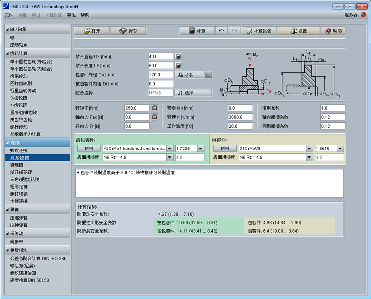 轴和轮毂的材料和表面粗糙度可以方便地从附带的数据库中选取,或者用户自定义。分别输出配合过盈量为中间、最小及最大值的计算结果。 如果其中的一个安全系数不达标,则用红色标出。