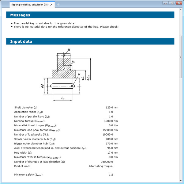 还在参数输入的过程中,结果显示窗口就会显示出工作载荷下以及最大载荷下所有三个零件即轴、轮毂以及键的各安全系数。计算完成后,可以生成计算报告来存档。 报告里记载了计算方法,输入的参数以及一份详细的计算结果。计算报告为HTML- 和 PDF-文件格式。