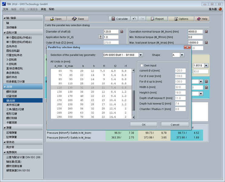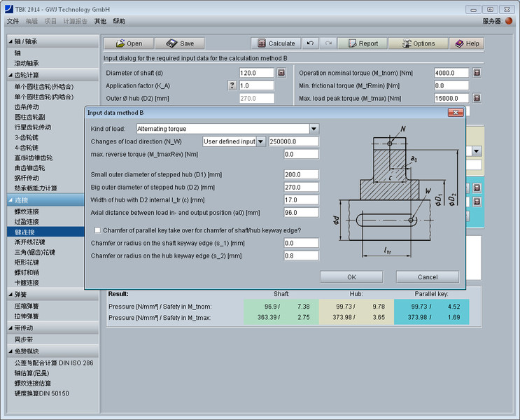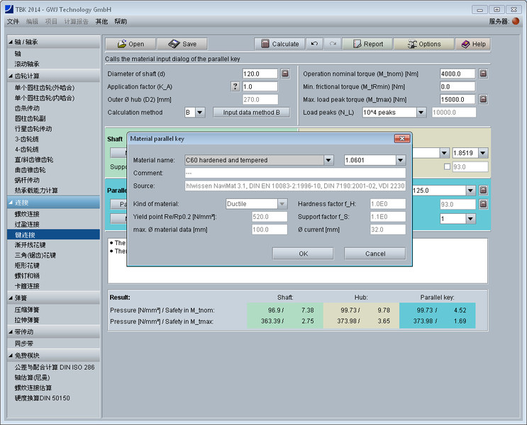 键连接的设计计算依据DIN 6892标准,可进行方法B和方法C的计算。 许用压力通过材料特征参数计算得出,从而使得特殊材料的使用成为可能。再者,可以考虑额外的摩擦扭矩,使得过盈和键连接组合情况的设计计算成为可能。