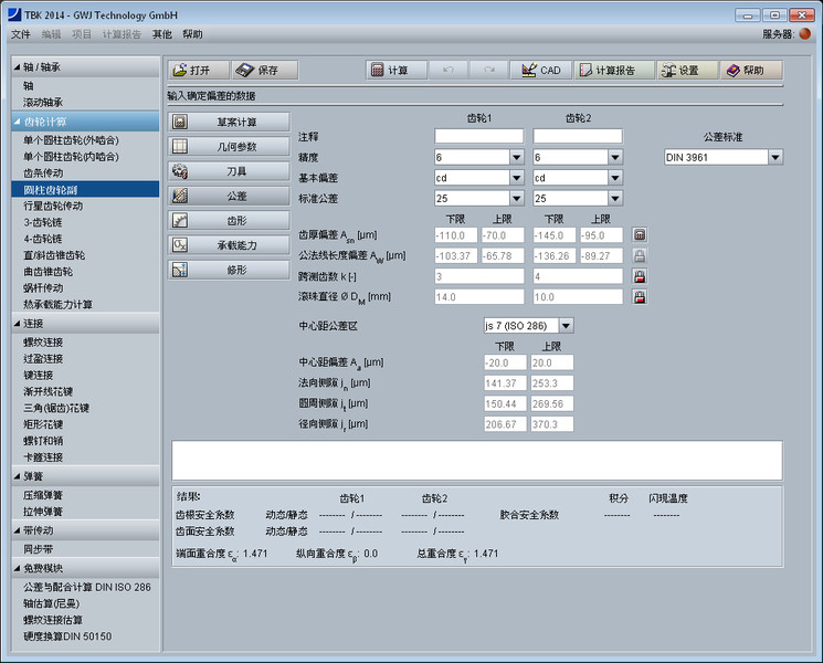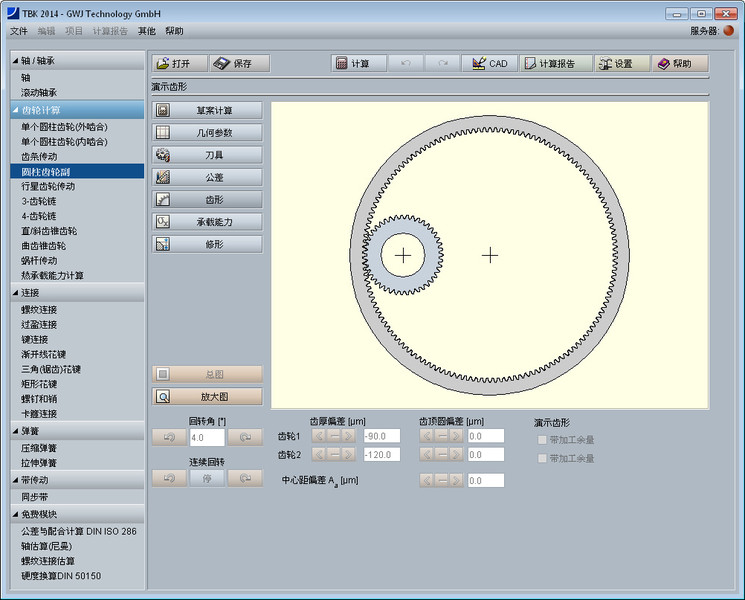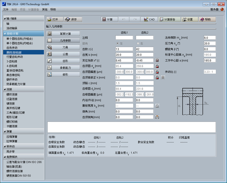 该齿轮设计模块用于简捷方便地计算圆柱齿轮副的几何尺寸,计算标准为DIN 3960, DIN 3961, DIN 3964, DIN 3967, DIN 3977 和 DIN 868。 可以计算直齿以及斜齿的外啮合和内啮合圆柱齿轮副。计算时考虑了齿廓变位,齿顶倒圆角以及公差。齿厚公差以及中心距偏差可以很方便地从列表框中选取。有计算齿轮平衡比滑时的齿廓变位系数的功能。轴间距可以用户自定义或者通过齿廓变位系数计算得出。 可供选择的基本齿条齿廓标准有ISO 53,DIN 867及DIN 3972,也可用户自定义刀具。可计算高齿和短齿。另外,可计算齿轮校验量规尺寸。这里,所需的跨测齿数以及量柱(球)的直径会自动计算得出。这些值用户也可自定义。另外,齿厚偏差的也可以通过校验量规尺寸倒推计算得出。