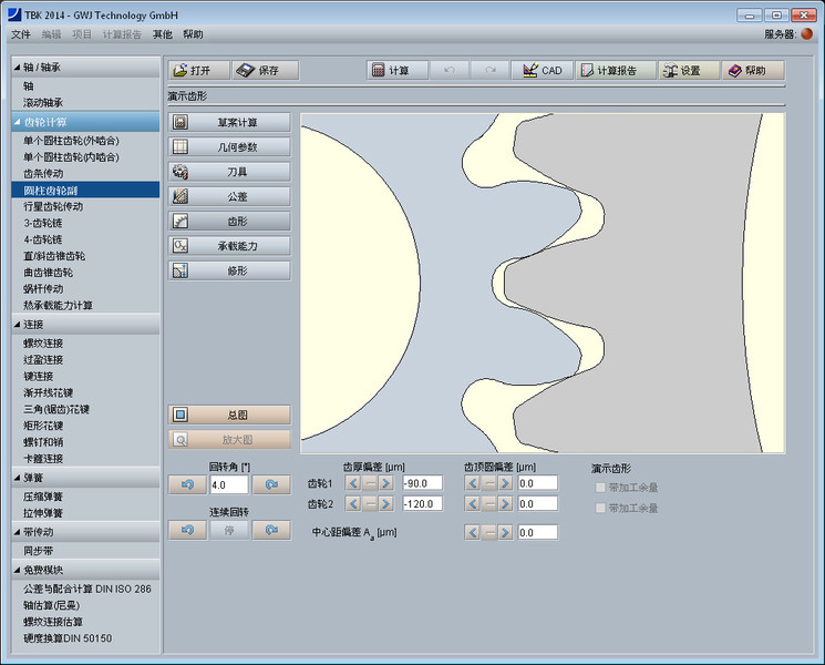 该模块的一个亮点是动画模拟轮齿啮合来演示计算得出的精准齿形。演示时可设置齿厚偏差、齿顶圆偏差及轴间距偏差的大小,可供选项为下极限偏差、中间值或上极限偏差。