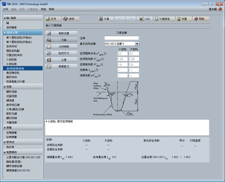 设计时用户得到关于齿宽大小的建议。可供选择的刀具基本齿条齿廓标准有ISO 53, DIN 867及DIN 3972,用户也可以自定义刀具。