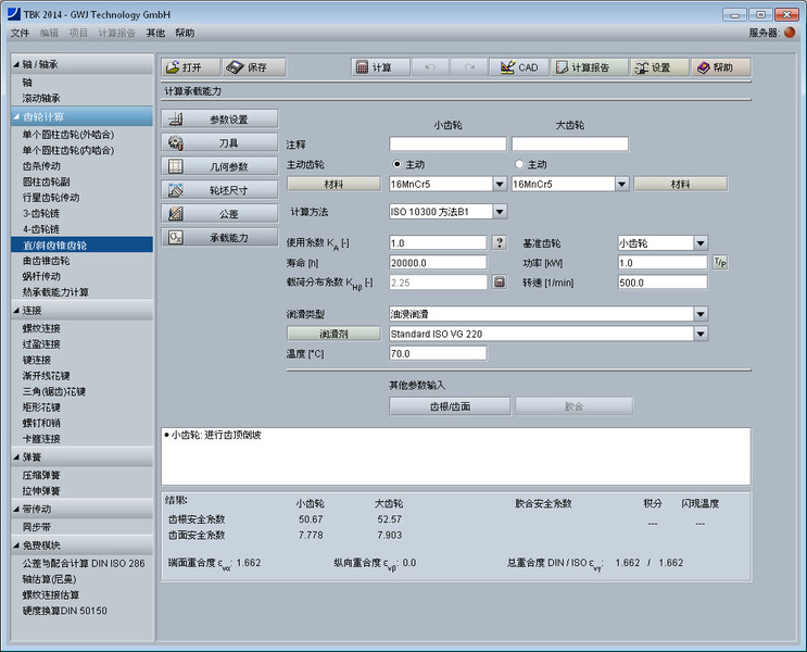 除了几何尺寸的计算,模块还提供了依据ISO 10300方法B1的齿轮承载能力的计算。 这里可以校核计算齿轮有限寿命疲劳和无限寿命疲劳以及静强度安全系数。计算齿根弯曲疲劳强度、齿面接触疲劳强度及点蚀承载能力。计算时可以调用软件的材料和润滑剂数据库。此外,计算时考虑齿轮工作方式如单向、正反交变循环或者频率正反转的影响。