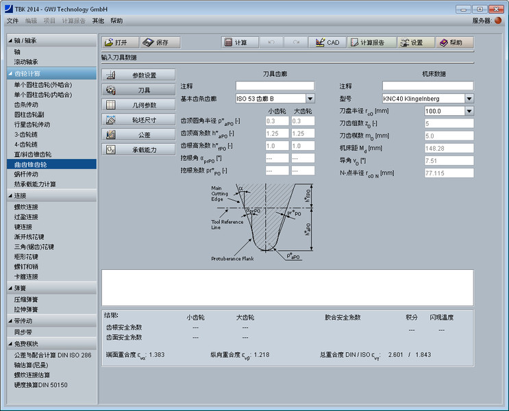 该齿轮模块方便简捷地计算Klingelnberg Zyklo-Palloid®系统ISO 23509 和 KN 3028标准的摆线齿锥齿轮的几何尺寸。设计时,用户得到齿宽、中点法向模数以及中点螺旋角的建议。有不同的刀具齿条齿廓标准如ISO 53, DIN 867 及 DIN 3972可供选择,或者用户自定义。此外,软件还提供了一系列克林根贝格机床系列,并建议可选的机床型号以及标准刀盘半径。另外,还可以按照ISO 23509标准选择刀盘或者用户自定义刀盘半径、刀片组数及刀片模数。