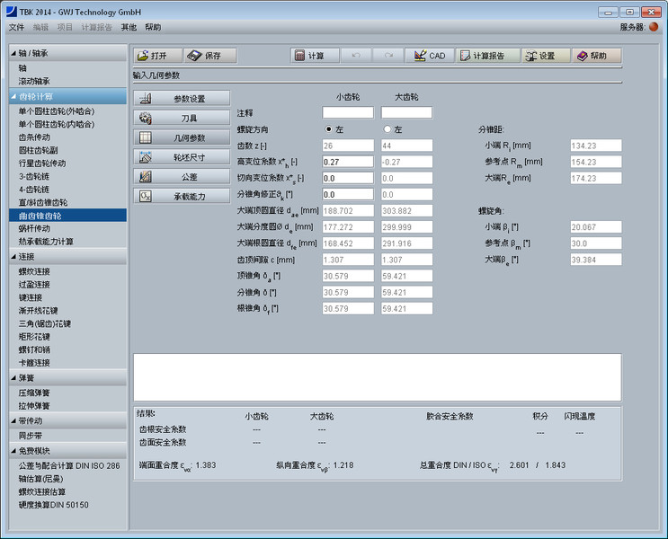 依据ISO 23509标准用当量齿轮计算端面重合度、纵向重合度以及总重合度的计算。再者,计算锥齿轮的的几何轮廓尺寸如锥距和螺旋角。其他轮体参数如安装距、轮冠距也将计算得出。安装距还可以用户自己定义。