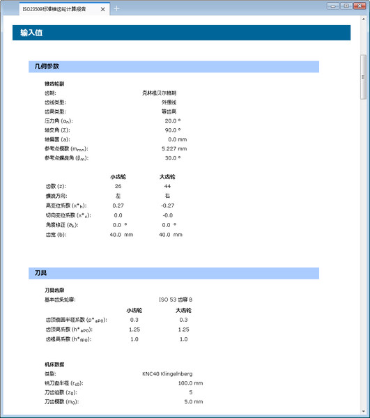 可以采用Klingelnberg或者Niemann关于齿侧间隙的建议,也可以用户自定义。各参数如轴线夹角误差和轴线交叉误差采用DIN 3965标准。齿轮精度依据ISO 17485标准。齿轮精度要求的公差以及允许的极限偏差也可以计算得出。此外,计算得出齿高、齿厚及弦齿厚。