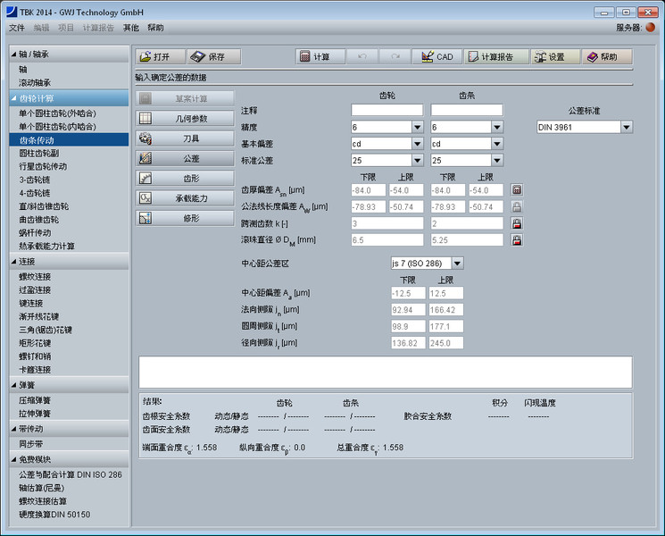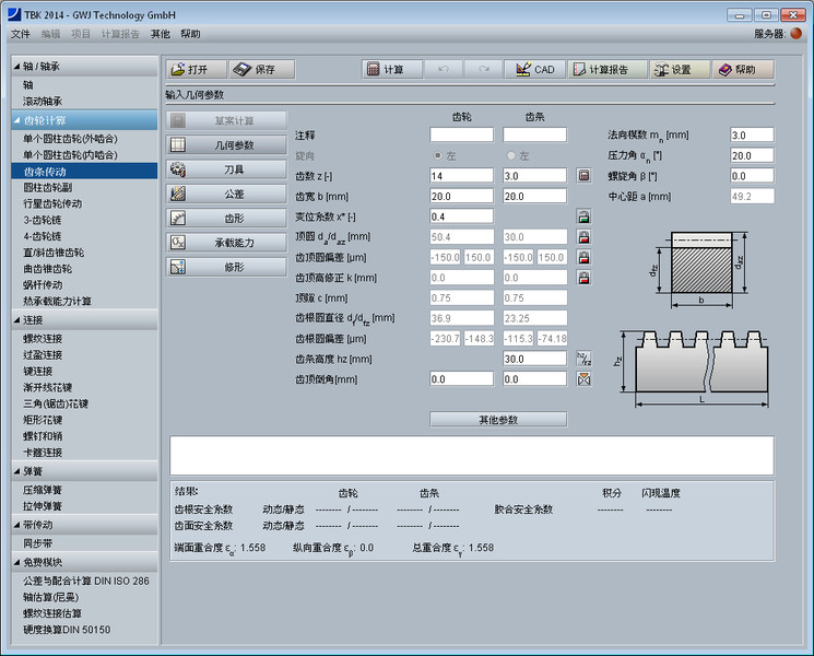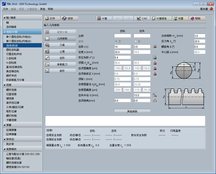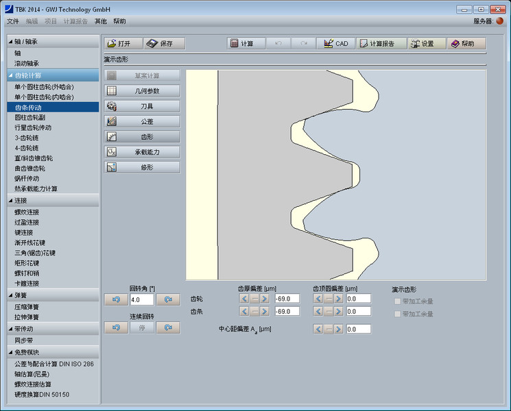 该齿轮设计模块简捷方便地进行齿轮齿条传动副的几何尺寸及强度校核计算。几何尺寸计算依据DIN 3960, DIN 3961, DIN 3964, DIN 3967, DIN 3977 和 DIN 868标准。 可以计算直齿以及斜齿。计算时考虑了齿廓变位,齿顶倒圆角以及公差。齿轮精度、齿厚偏差以及中心距偏差可以很方便地从列表框中选取。轴间距可以用户自定义或者通过齿廓变位系数计算得出。 可供选择的基本齿条齿廓标准有ISO 53,DIN 867及DIN 3972,也可用户自定义刀具。可计算高齿和短齿。另外,可计算齿轮校验量规尺寸。这里,所需的跨测齿数以及量柱(球)的直径会自动计算得出。这些值用户也可自定义。另外,齿厚偏差也可以通过校验量规尺寸倒推计算得出。