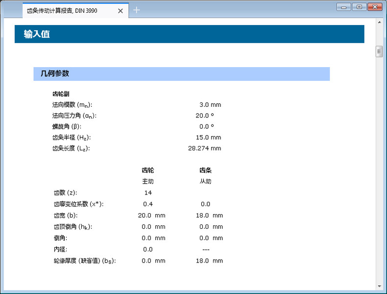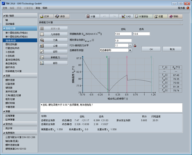 除了齿轮几何尺寸的计算外,模块还提供了齿轮承载能力依据DIN 3990 方法B的计算。 这里可以校核计算齿轮有限疲劳寿命和无限疲劳寿命以及静强度。计算齿根弯曲疲劳强度,齿面接触疲劳强度及点蚀承载能力。胶合承载能力的计算用积分以及闪温参数计算。轮齿啮合时的接触温度用曲线图显示。此外,齿根和齿面或者点蚀承载能力的计算也可依据ISO 6336 (2008) 方法B计算。胶合的计算使用ISO/TR 13989标准。