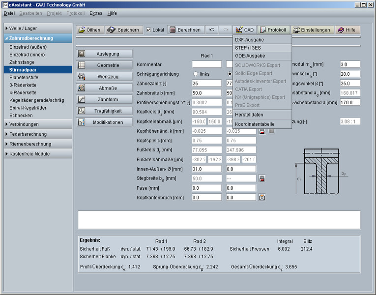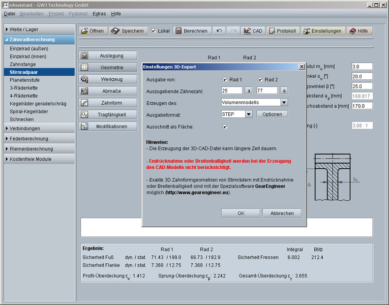 Zur Zeit beinhalten folgende Berechnungsmodule den STEP-/IGES-Export: Einzelräder (außen/innen), Stirnradpaare, Planetenstufen, 3er- und 4er-Räderkette, Zahnstangen, gerad- und schrägverzahnte Kegelräder, spiralverzahnte Kegelräder sowie Zahnwellenverbindungen (DIN 5480 etc.).