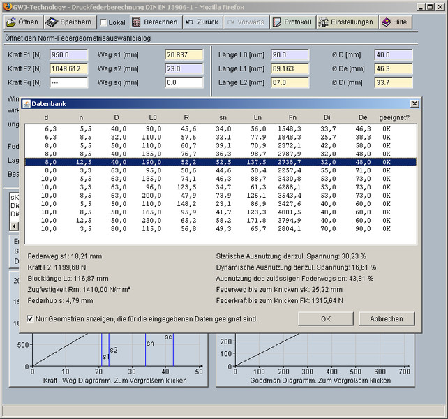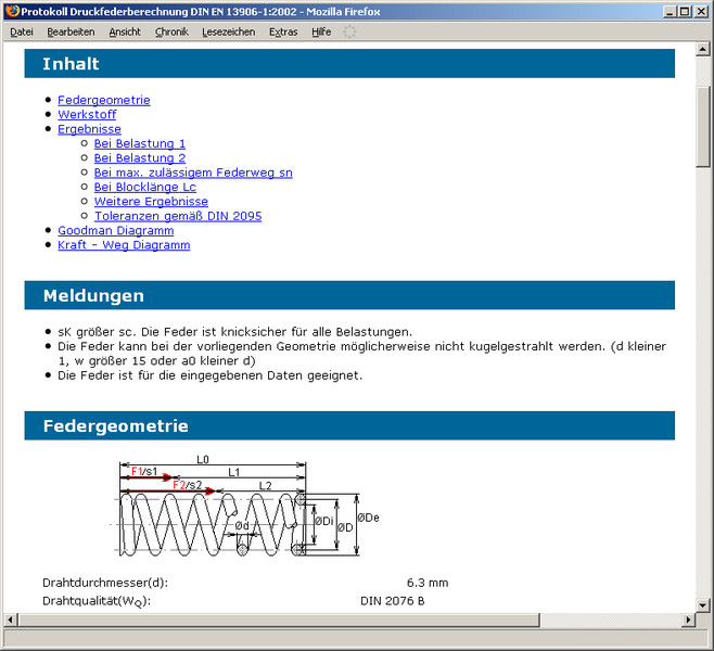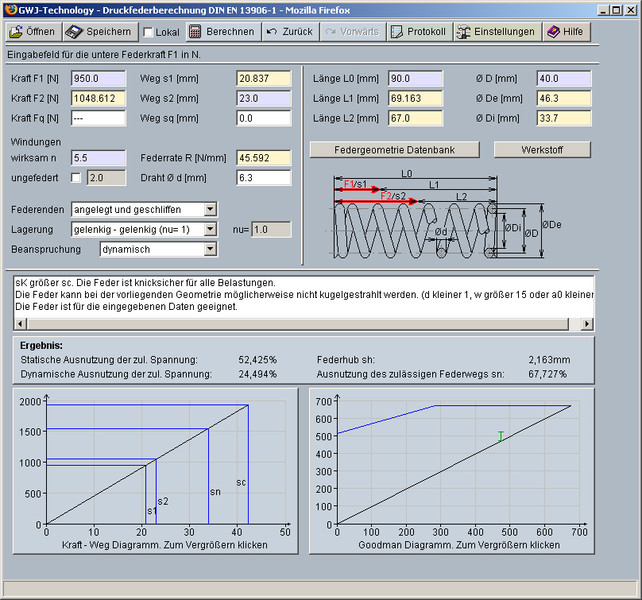 Die wichtigsten Ergebnisse, d.h. die statische und dynamische Ausnutzung der zulässigen Spannung, der Federhub und die Ausnutzung des zulässigen Federweges werden bereits während der Eingabe übersichtlich angezeigt. Zusätzlich erfolgt die Darstellung des Goodman- und des Kraft-Weg-Diagramms. Die Diagramme lassen sich per Mausklick vergrößert darstellen.