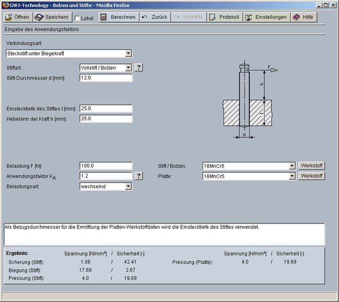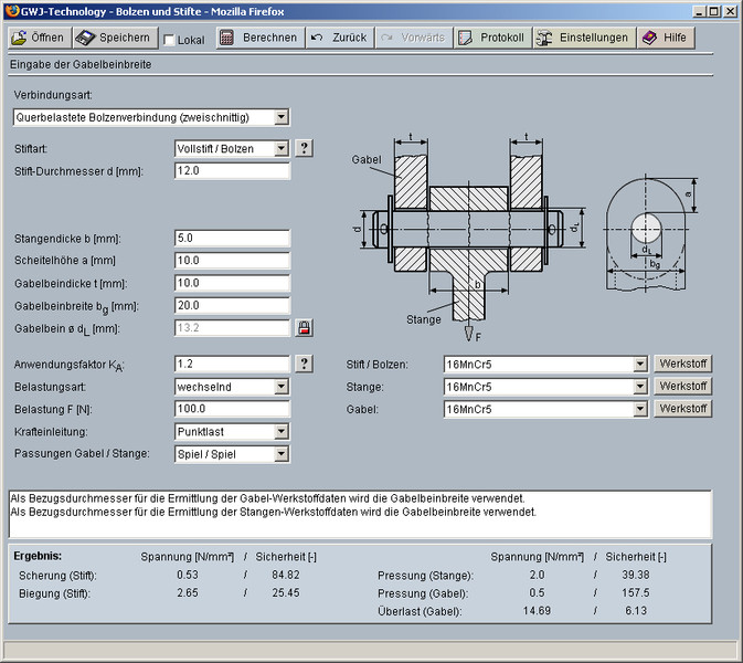 Alle Berechnungen erfolgen auf Basis anerkannter Fachliteratur, wie zum Beispiel nach Niemann und Decker. Weiterhin sind für die Berechnung verschiedene Stiftarten verfügbar. So kann zwischen Bolzen bzw. Vollstift, Kerbstift, Spannstift oder Spannhülse sowie Spiralspannstift gewählt werden.