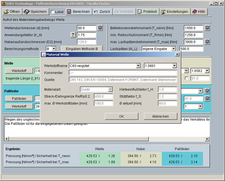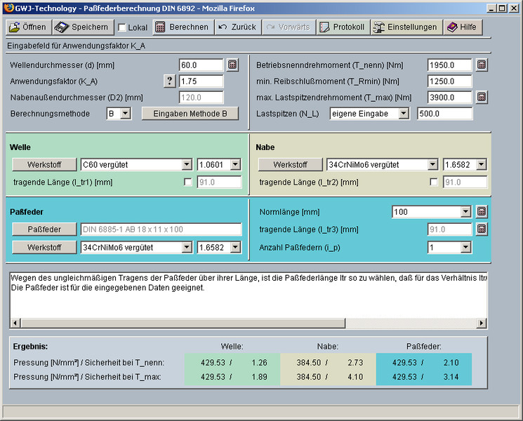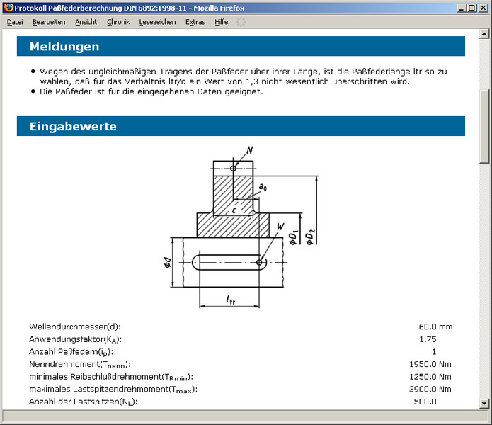 In der Ergebnisübersicht werden die Sicherheiten bei der Betriebsbelastung und bei der maximalen Belastung für alle drei Komponenten, Welle, Nabe und Passfeder, bereits während der Eingabe übersichtlich angezeigt. Nach Abschluss der Berechnung kann zur Dokumentation ein Berechnungsprotokoll generiert werden. Dieses enthält die Angabe der Berechnungsmethode, die Eingabedaten und die detaillierten, nachvollziehbaren Ergebnisse.