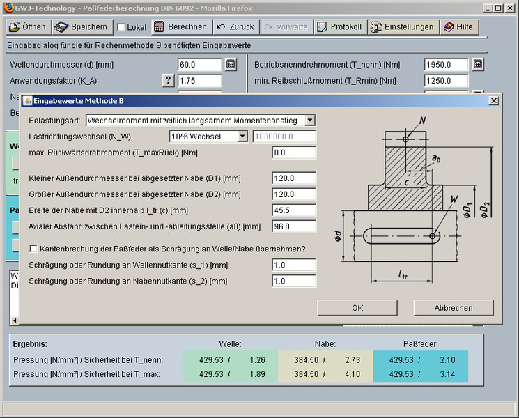 Für unterschiedliche Lastein- bzw. ableitungen wird der Lastverteilungsfaktor auf der Basis geometrischer Vorgaben des Anwenders berechnet. Zusätzlich können die Anzahl Lastspitzen und die Art eines vorhandenen Wechseldrehmomentes für die Berechnung angegeben werden. Für ein komfortables Arbeiten steht neben der datenbankgestützten Werkstoffauswahl auch die Passfederauswahl nach DIN 6885 Blatt 1 bis 3 zur Verfügung. Hier kann bequem die Passfederform und Größe ausgewählt werden. Zusätzlich sind ebenfalls die zugehörigen genormten Längen für die Passfederformen hinterlegt.