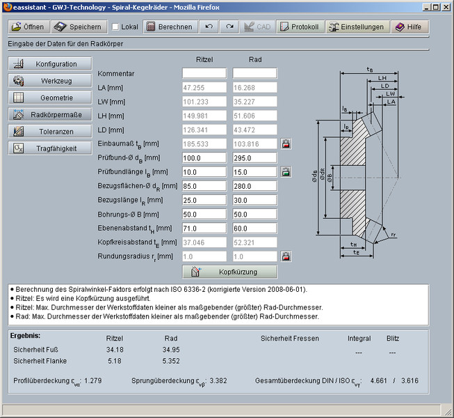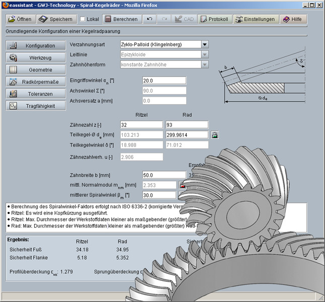 Die Berechnung der Profil-, Sprung- und Gesamtüberdeckung erfolgt gemäß ISO 23509 anhand der Ersatzverzahnung. Weiterhin werden die Drehmaße mit Kegellängen und Spiralwinkeln berechnet. Ergänzend werden weitere Radkörpermaße inklusive Kopfkreisabstand und Einbaumaß ermittelt. Das Einbaumaß kann zusätzlich individuell vorgegeben werden.