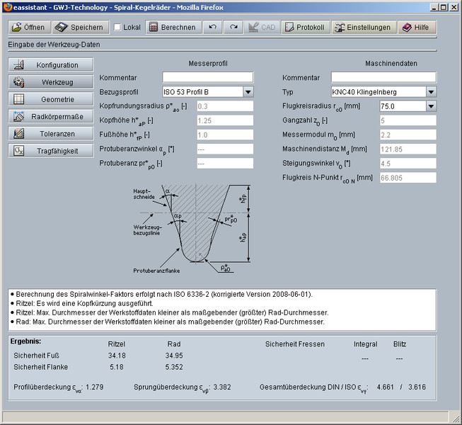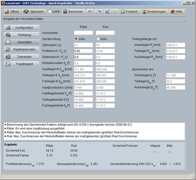 Neben der Geometrieberechnung steht auch die Tragfähigkeitsberechnung nach ISO 10300 Methode B1 zur Verfügung. Hiermit können die Sicherheiten für Zeit- bzw. Dauerfestigkeit sowie für die statische Sicherheit berechnet werden. Es werden die Zahnfuß- sowie Flanken- bzw. Grübchentragfähigkeit ermittelt. Innerhalb der Tragfähigkeits- bzw. Festigkeitsberechnung stehen eine Werkstoff- und Schmierstoffdatenbank zur Verfügung. Zusätzlich kann auch die Betriebsweise, d.h. schwellender, wechselnder oder reversierender Betrieb, mit in der Berechnung berücksichtigt werden.