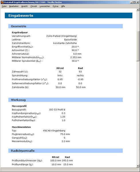 Die Flankenspiele können nach Klingelnberg oder Niemann ausgelegt oder individuell vorgegeben werden. Weiterhin stehen die Toleranzen DIN 3965 für Abweichungen einzelner Bestimmungsgrößen, d.h. Achsenwinkel- und Achsenschnittpunkts-abweichungen zur Auswahl. Die Verzahnungsqualitäten können nach ISO 17485 gewählt werden. Die sich aus der gewählten Verzahnungsqualität ergebenden Toleranzen bzw. zulässige Abweichungen werden ebenfalls mit berechnet. Darüber hinaus werden die Zahnhöhen, Zahndicken und Zahndickensehnen ermittelt.