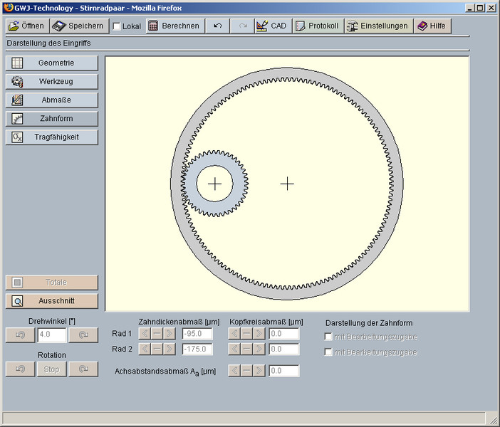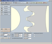 Ein besonderes Highlight des Moduls ist die Darstellung der exakt berechneten Zahnform mit Animation/Simulation des Zahneingriffs. Für diese Darstellung können die kleinsten, mittleren und größten Abmaße für die Zahndicken, die Kopfkreise und den Achsabstand gewählt werden. Weiterhin erhält der Anwender entsprechende Hinweise oder Warnungen, z.B. für möglicherweise auftretende Eingriffsstörungen. Die Prüfung auf Eingriffsstörungen erfolgt permanent im Hintergrund auf Basis der exakten Zahnform.