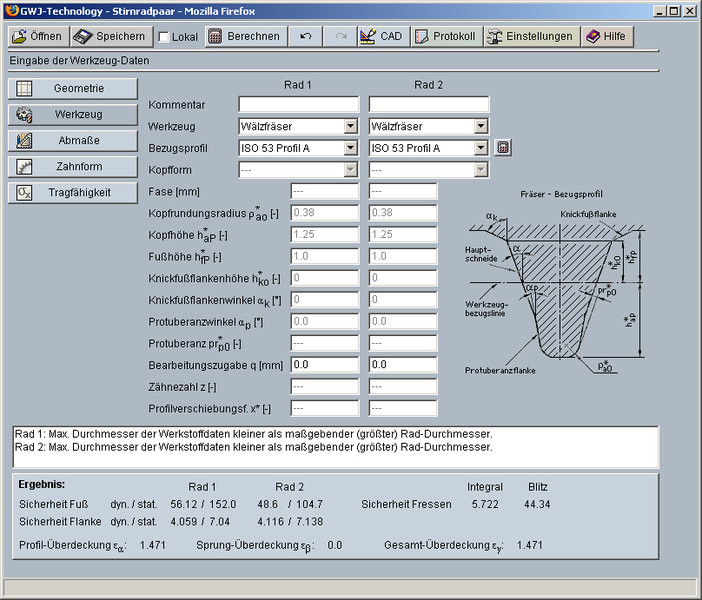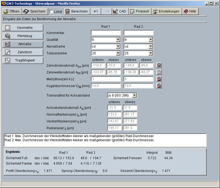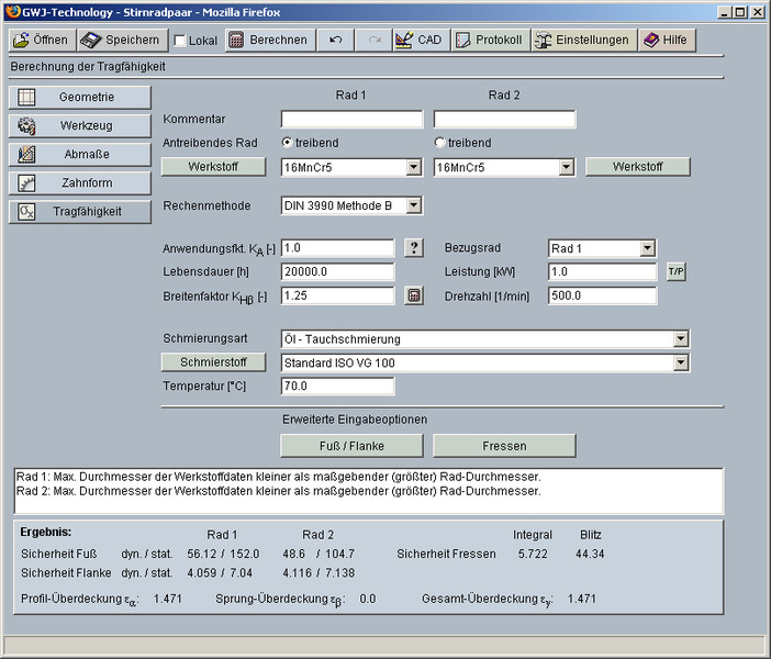 Neben der Geometrieberechnung steht auch die Tragfähigkeitsberechnung nach DIN 3990 Methode B zur Verfügung. Hiermit können die Sicherheiten für Zeit- bzw. Dauerfestigkeit sowie für die statische Sicherheit berechnet werden. Es werden die Zahnfuß- sowie Flanken- bzw. Grübchentragfähigkeit und die Fresstragfähigkeit nach dem Integral- und Blitztemperaturkriterium ermittelt. Der Verlauf der Kontakt-temperatur über den Zahneingriff wird grafisch dargestellt.