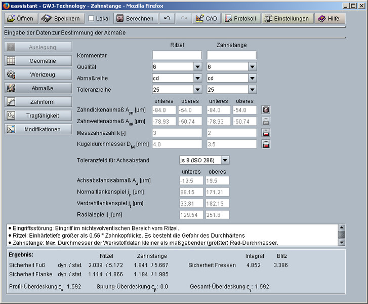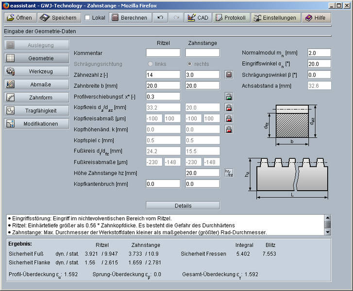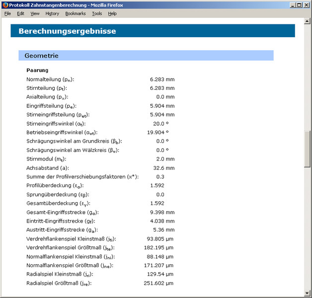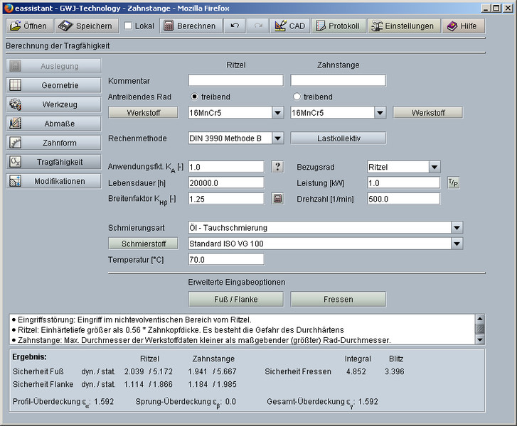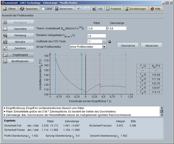 Neben der Geometrieberechnung steht auch die Tragfähigkeitsberechnung nach DIN 3990 Methode B zur Verfügung. Hiermit können die Sicherheiten für Zeit- bzw. Dauerfestigkeit sowie für die statische Sicherheit berechnet werden. Es werden die Zahnfuß- sowie Flanken- bzw. Grübchentragfähigkeit und die Fresstragfähigkeit nach dem Integral- und Blitztemperaturkriterium ermittelt. Der Verlauf der Kontakt-temperatur über den Zahneingriff wird grafisch dargestellt.