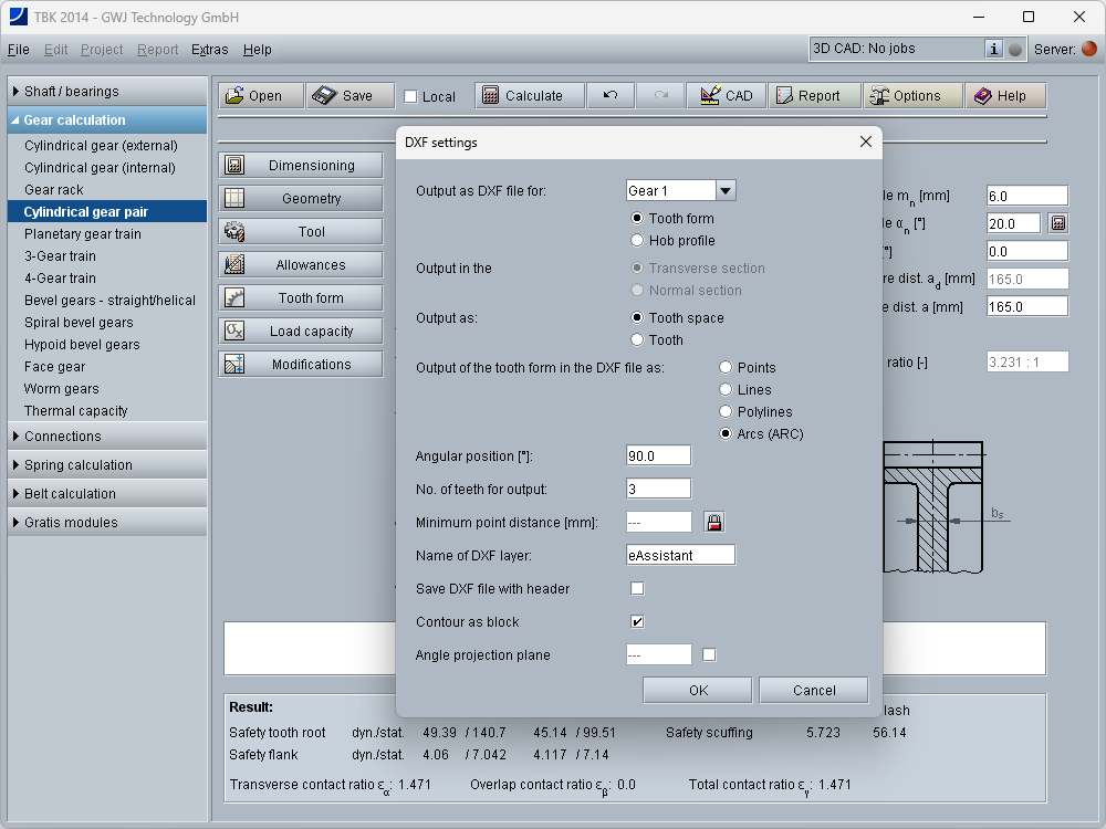 For involute tooth forms, the output in 2D DXF format is possible with various setting options. The DXF output is available for single cylindrical gear (external/internal), cylindrical gear pairs, planetary gear trains, three- and four-gear train systems, gear racks, involute splines.