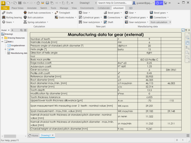 - A simple mouse-click allows to add all necessary manufacturing data of a gear wheel to the drawing. The data is displayed as a table. The appearance and size of that table is individually configurable.