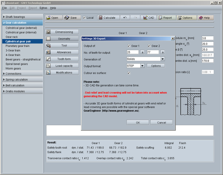 Currently the following calculation modules include the new STEP/IGES export feature: single cylindrical gears (external/internal), cylindrical gear pairs, planetary gear trains, three- and four-gear train systems, gear racks, straight, helical and spiral bevel gears as well as involute splines (DIN 5480 etc.).