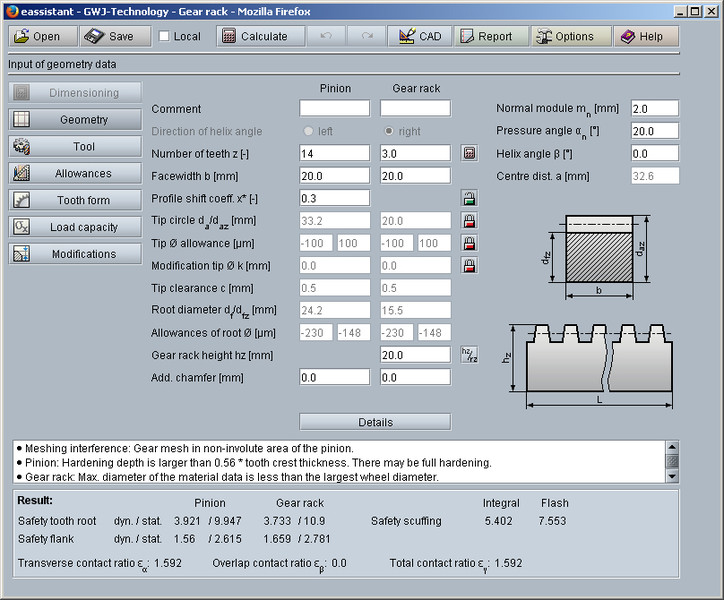 In addition to the geometry calculation, the load capacity calculation according to DIN 3990 Method B is also available. Herewith the safeties for fatigue or limited life strength and static strength can be calculated. The calculation of surface durability (pitting), tooth bending strength and scuffing according the flash and integral temperature method is carried out. A diagram for the contact temperature over the length of the line of action is also available.