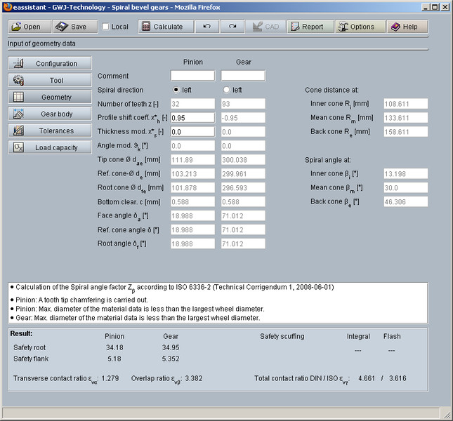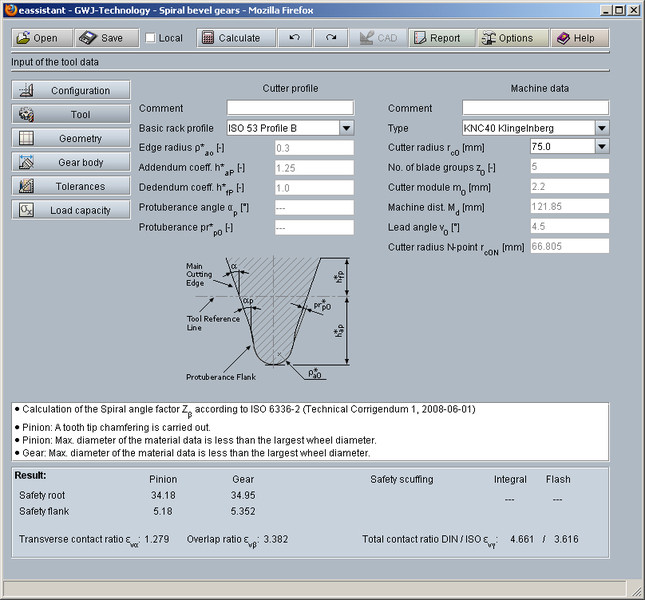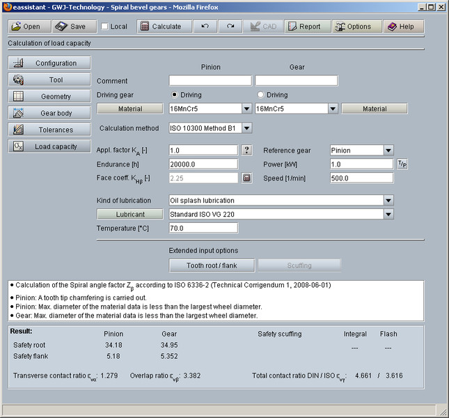 In addition to the geometry calculation, a calculation of the load capacity according to ISO 10300 Method B1 is possible. The user can calculate the safeties for fatigue or limited life strength and static strength (tooth root, flank / pitting, scuffing). Material and lubricant databases support the user. Additionally, the mode of operation is considered (swelling, alternating and oscillating).