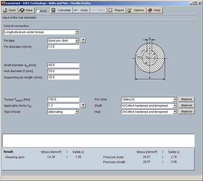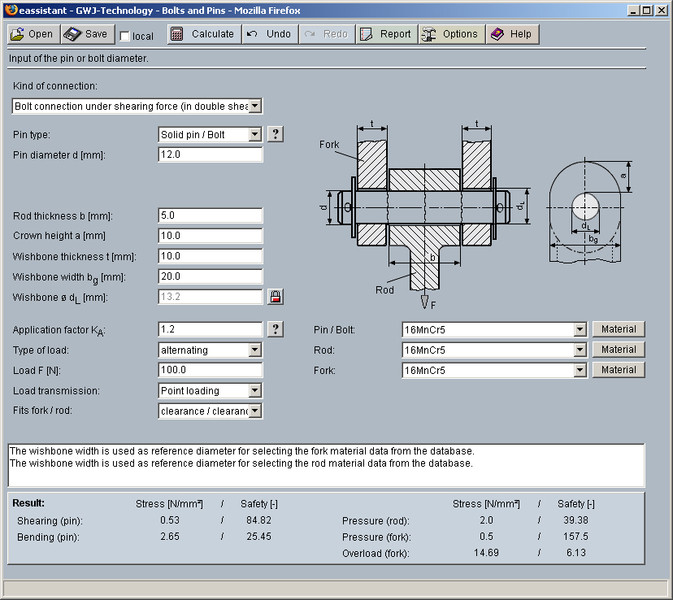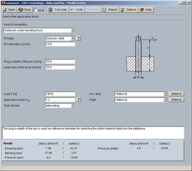 All calculations are based on generally accepted literature (e.g., Niemann and Decker). Futhermore, different pin types are available for the calculation: solid pin/bolt, grooved pin, (hollow) dowel pin as well as coiled spring pin.