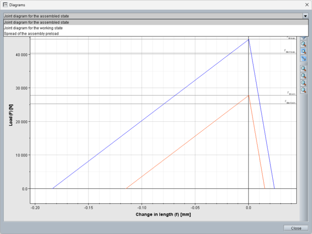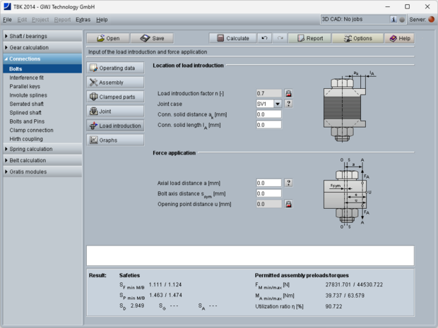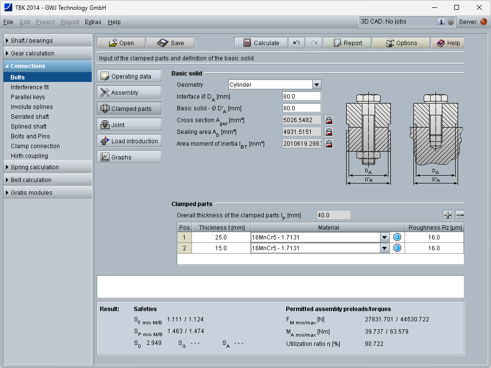 The user can choose clamped parts and can define the basic solid geometry, the load introduction and force application. Both centric and eccentric tensions are supported. The calculation module proposes a nominal diameter. Illustrations help to better understand the geometry. A suggestion function is also available for selecting the nominal bolt diameter.