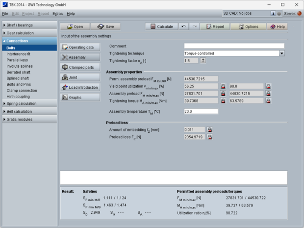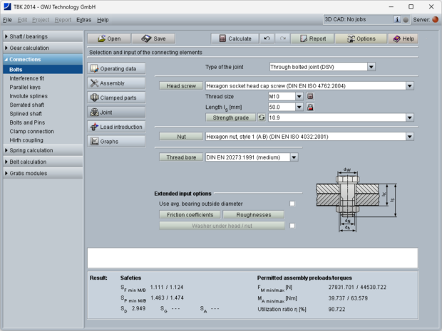 A drop-down menu allows to select different tightening techniques, for example angle-controlled and yield-controlled tightening. Based on the selected tightening technique, the tightening factor will be set automatically. The tightening factor can also be specified individually. The module provides the possibility to modify the utilization of the yield point, e.g., for 100 percent instead of 90 percent. Tapped thread joints and through bolted joints can be selected from a drop-down menu and can then be configured fast and easily.