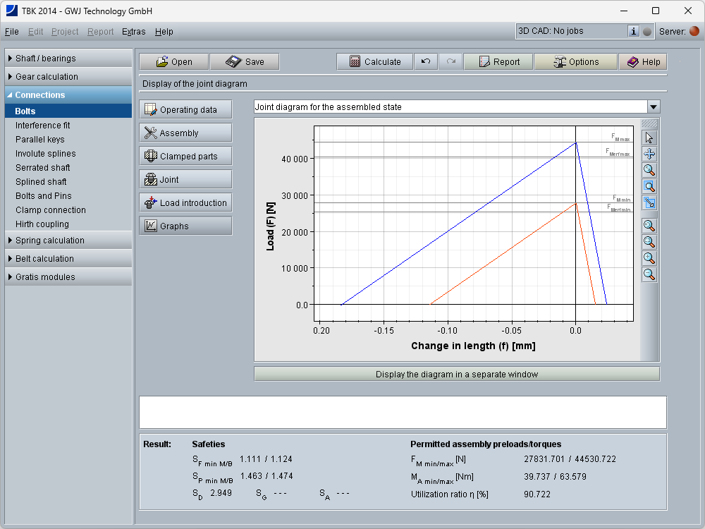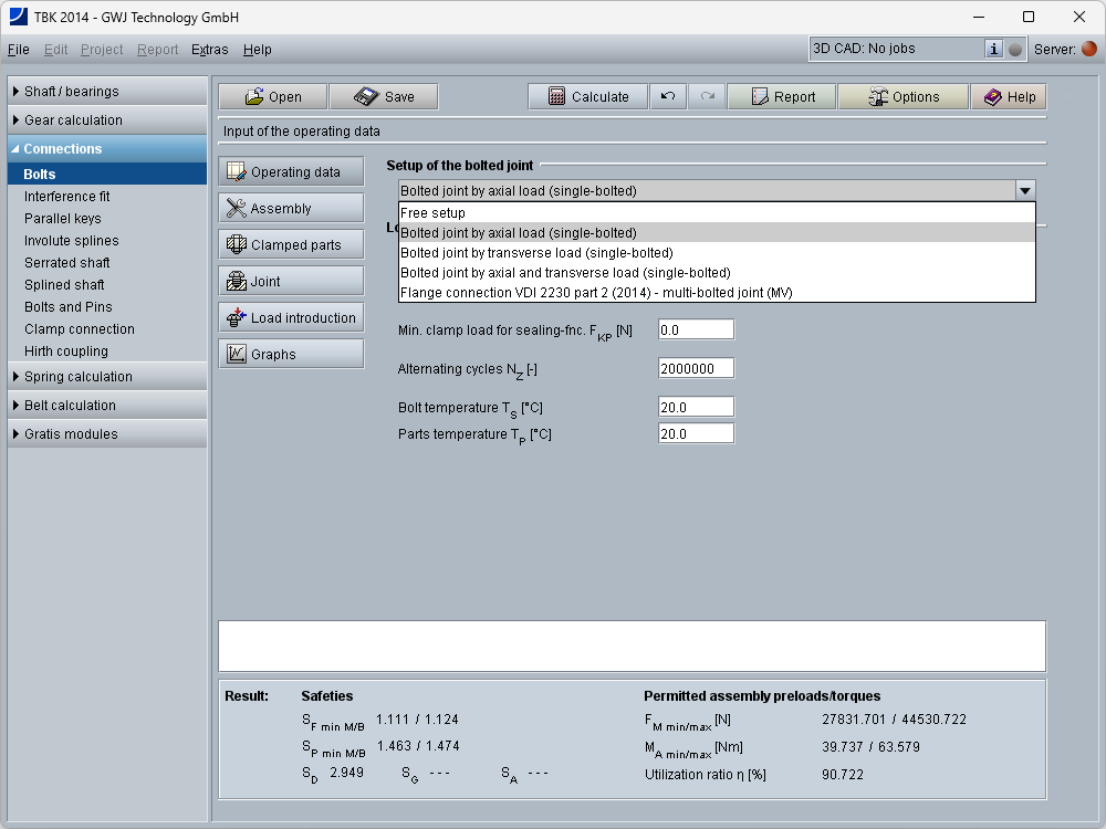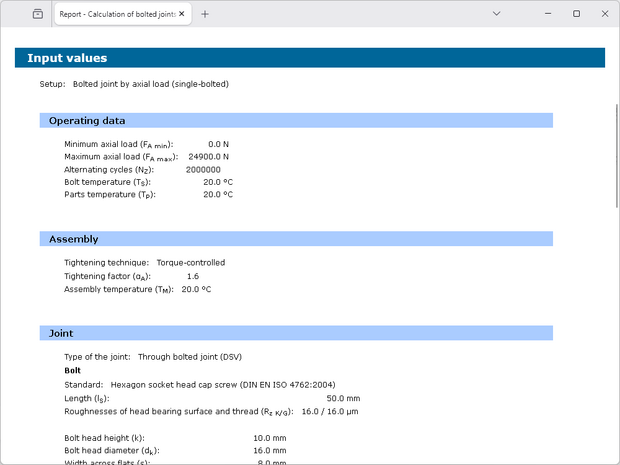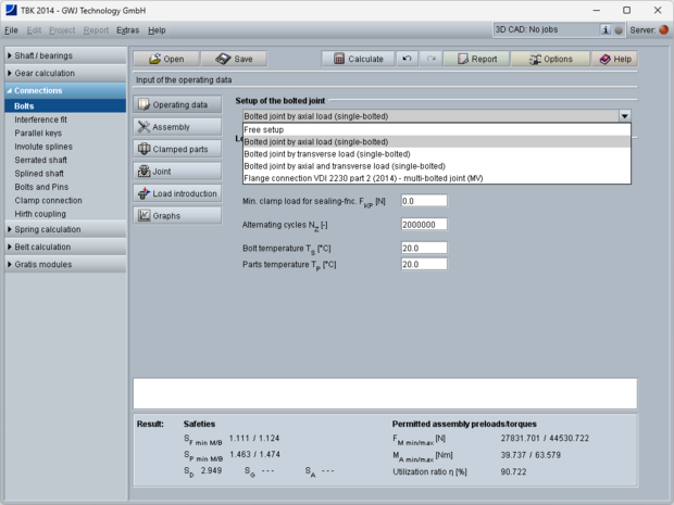 The calculation module allows to determine single-bolted joints under axial and transverse load (according to VDI 2230-1) and flange connections (multi-bolted) (according to VDI 2230-2). The user can define bolted joints as necessary to meet special requirements.
