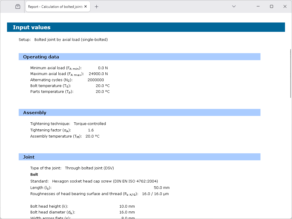 - Single-bolted joints under axial and transverse load and flange connections (multi-bolted) can be determined.