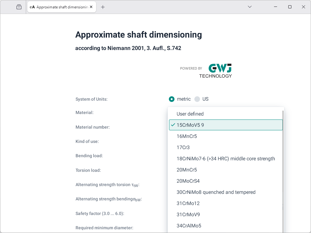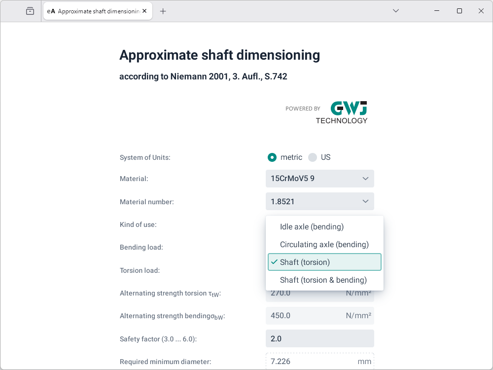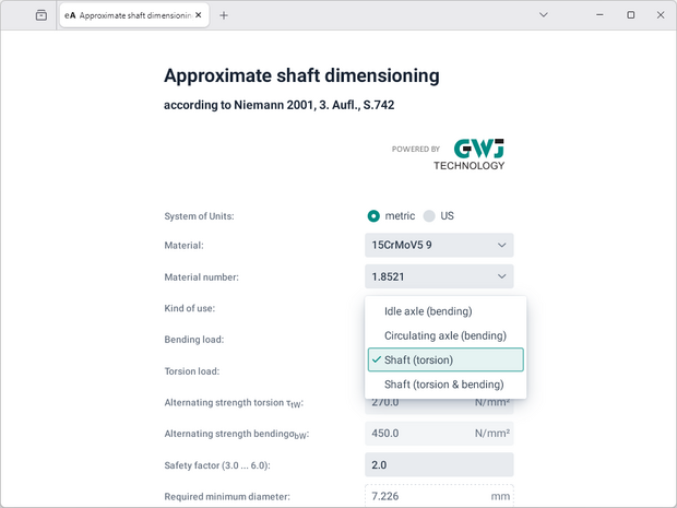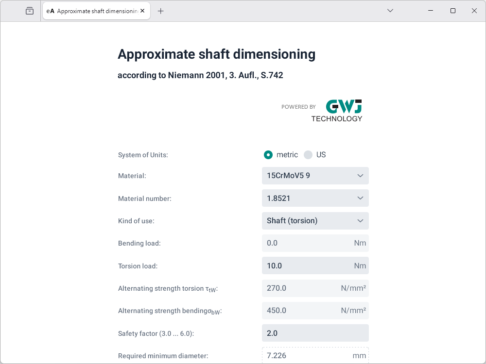After the input of the loads (bending load, torsion load or both) and the desired safety factor, the required minimum diameter will be calculated.