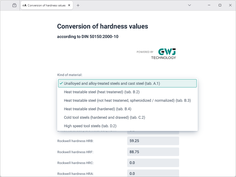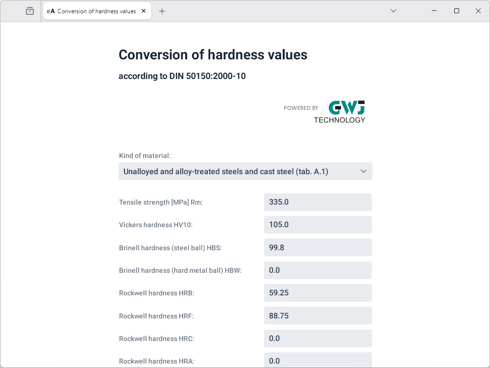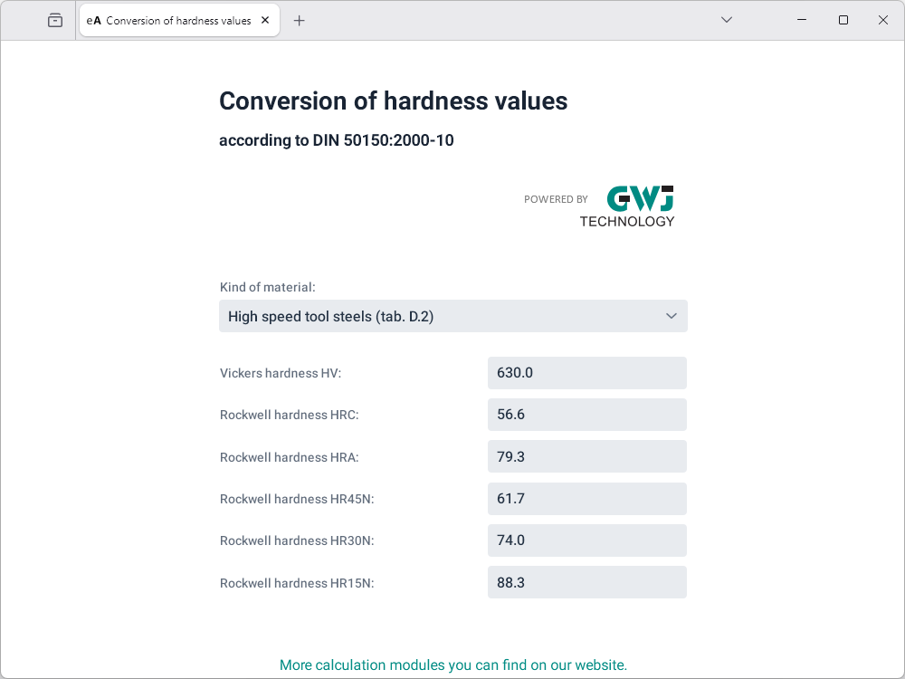 Using this module, it is possible to convert different hardness values into each other. The hardness values also can be determined by the input of the tensile strength. Different kind of materials can be selected for the calculation: